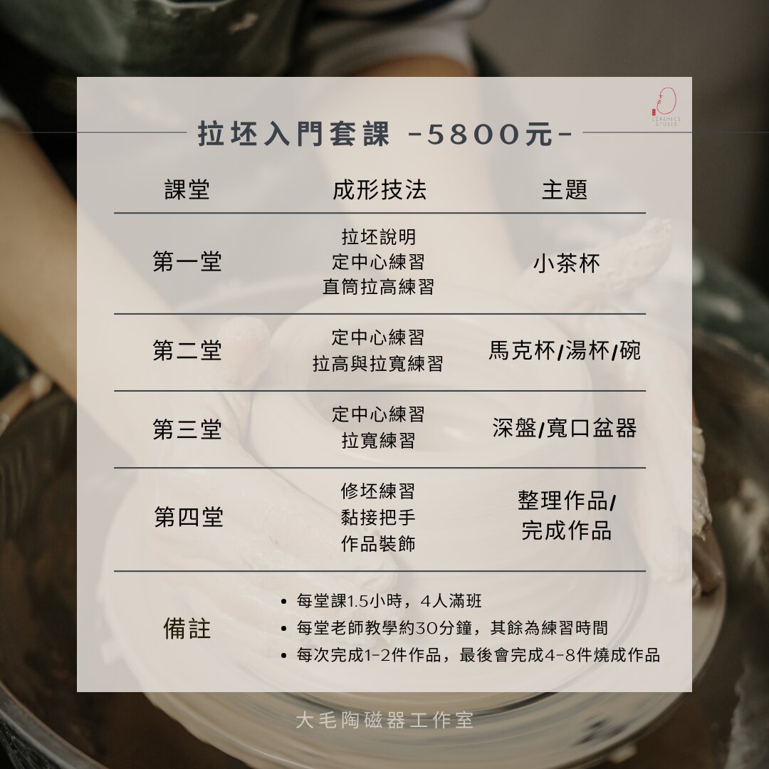 這些課程旨在提供學員一個深入的拉胚技法學習體驗。課程內容將由老師進行教學並指導,同時也給予學員實際操作的時間。
