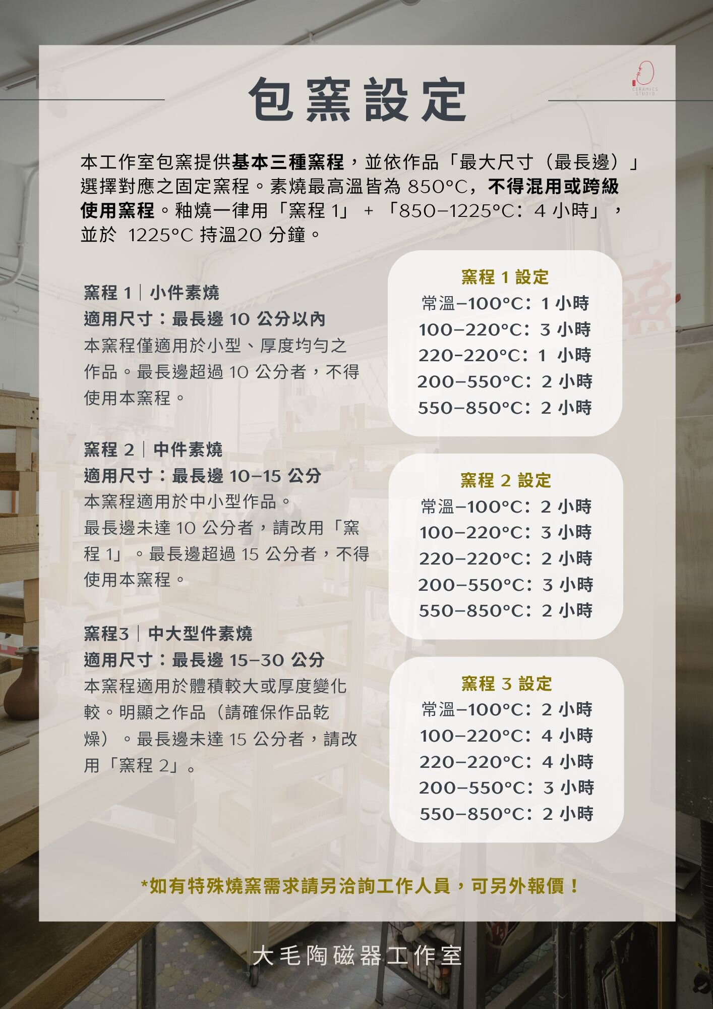 *特殊燒窯需求請另洽詢工作人員,可另外報價